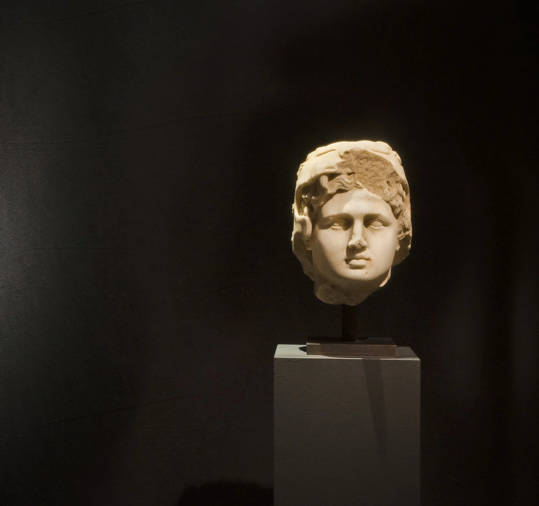 This exceptional marble head of a young man wearing the lion-head helmet presents several and fascinating research issues related to the iconography of Alexander the Great and the practices in the Greek Hellenistic sculpture. One should consider and answer a variety of questions: whether the head represents the young Herakles or the young Alexander as Herakles or Alexander simply wearing the lion-head helmet; if the portrait of Alexander: was it was created within Alexander’s own lifetime or later; how did the entire statue, to which the head belongs, look like; if the figure was single or made part of the sculptural group, etc.