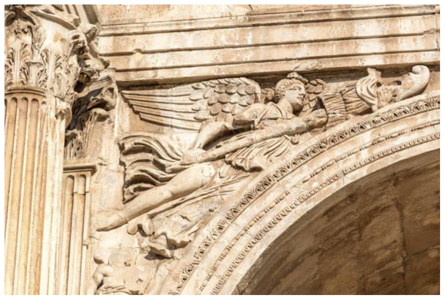 Wing feathers were represented differently in ancient art depending on the time period, knowledge of bodily anatomy, artistic style, and also the material of which the artwork was executed. The type of the wings was differentiated depending on the individual iconography (an eagle or eagle-based creature and a winged Eros have different types) and composition (if the image was represented still or in motion). The representation of the feather size in this present statuette is consistent with general anatomical structure of the eagle wing and the arrangement by rows, with shorter marginal and primary covers and longer primaries and secondaries. The multidirectional disposition of the feathers is affected by the figure’s movement in the air opposing the wind. Similar representations are found in the reliefs of the Pergamon Altar, 2nd century B.C., particularly in the wings of the giant Alkyoneus to the left of Athena and Nike to her right.